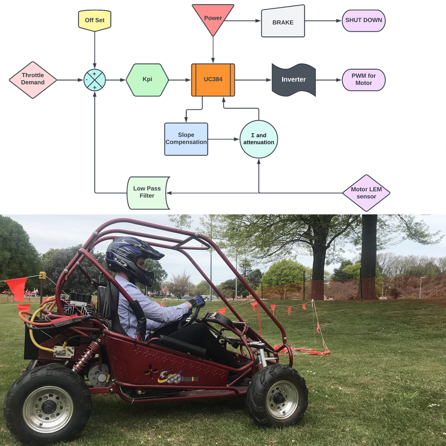Alex Delyagin and I designed, built, tested and deployed an analogue control system that ensured a Go-Kart motor would deliver a safe amount of power for a demanded acceleration. This was achieved via a Fixed Frequency Current Mode Controller (FFCMC). My peers raced against one another to determine who had the fastest lap time, and thereby the most efficient circuit.