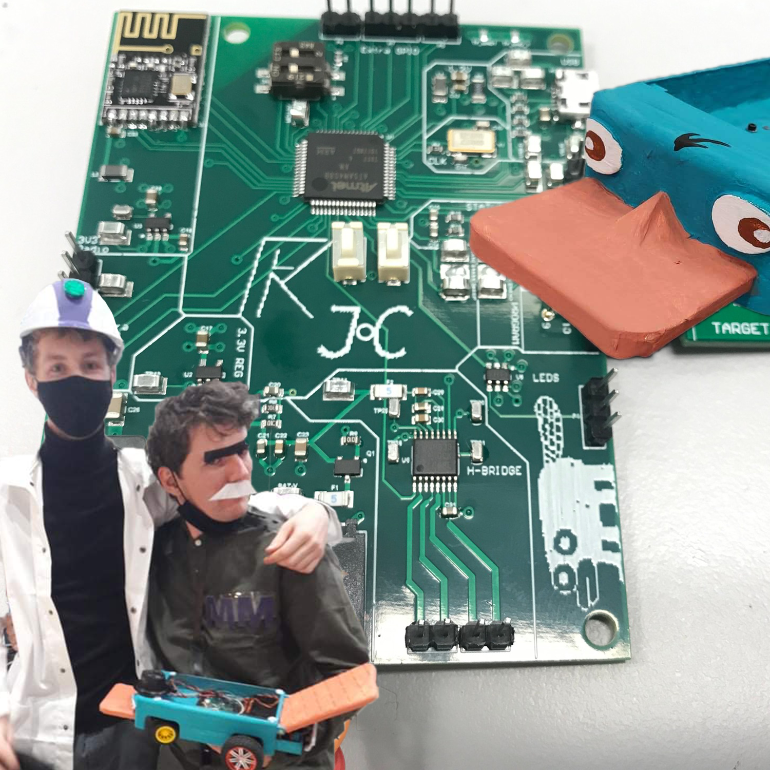 From processing-unit, to programming, to chassis, all aspects of our wacky racer were custom made. The controller was located in the user's hat and would control the car via head movements.